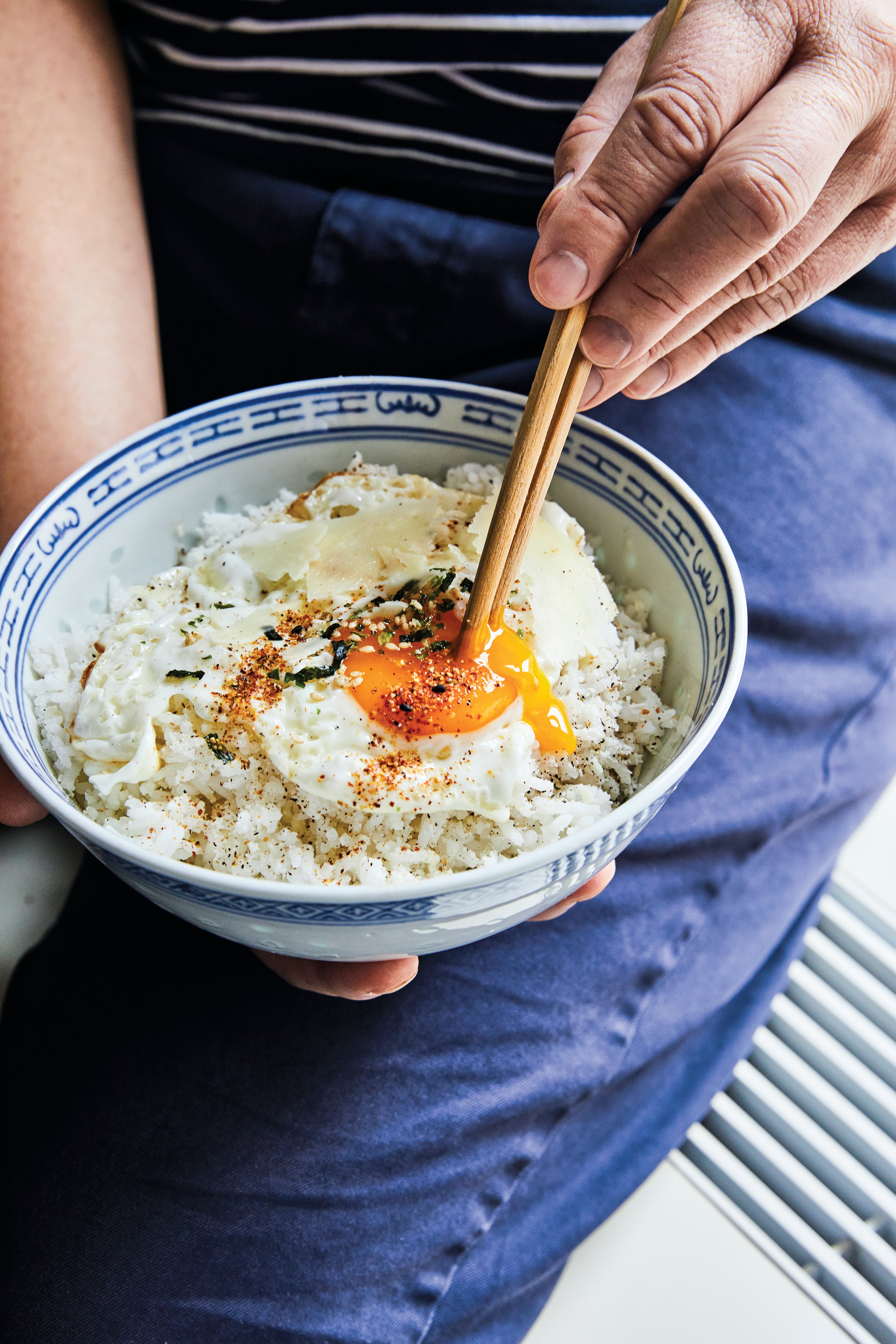 To me, there’s nothing more comforting or familiar than a bowl of rice. Every dinner from my childhood featured steamed rice, and most of the time I was the one tasked with putting on the rice before my parents returned from work. Enter this recipe—comforting, oh-so tasty, and the ideal companion to practically any dish. I’ve infused the flavors of the Italian classic cacio e pepe into sticky rice (also known as sweet or glutinous rice) and topped it off with a sunny-side up egg, a hit of umami from nori, and a bit of spice from togarashi. A perfect snack or side (with or without the egg), it’s also the perfect base for adding salmon or roast chicken.
