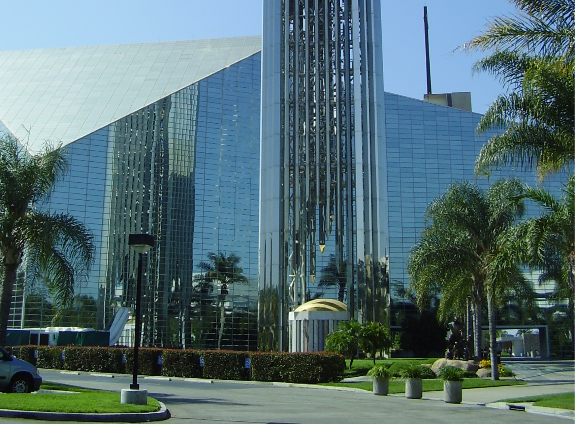 Modern glass cathedral with a tall, intricate metal tower against a clear blue sky