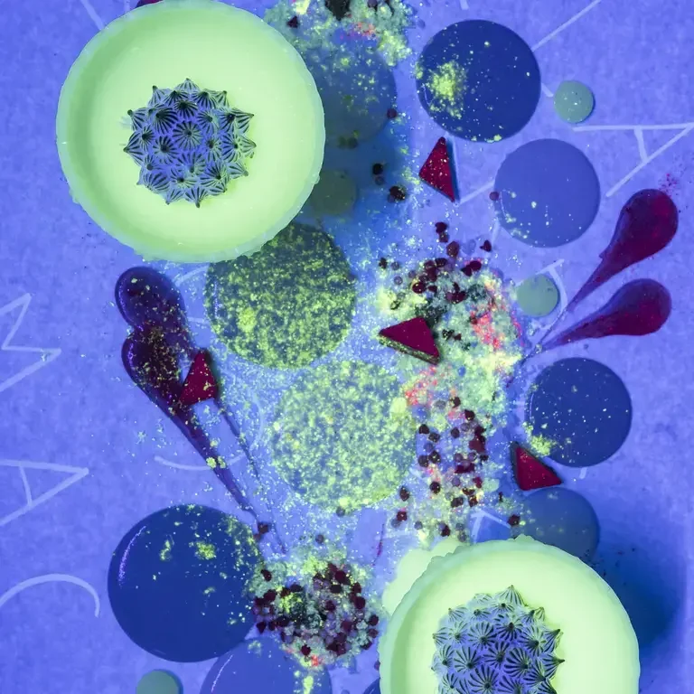 The hallway was lined with moss. There was glass blown into flowers. Somewhere, there was a snack tucked into the petals. Guests were handed a flashlight—yes, really—and told to find the next course themselves. Later, they crossed the street for dessert.