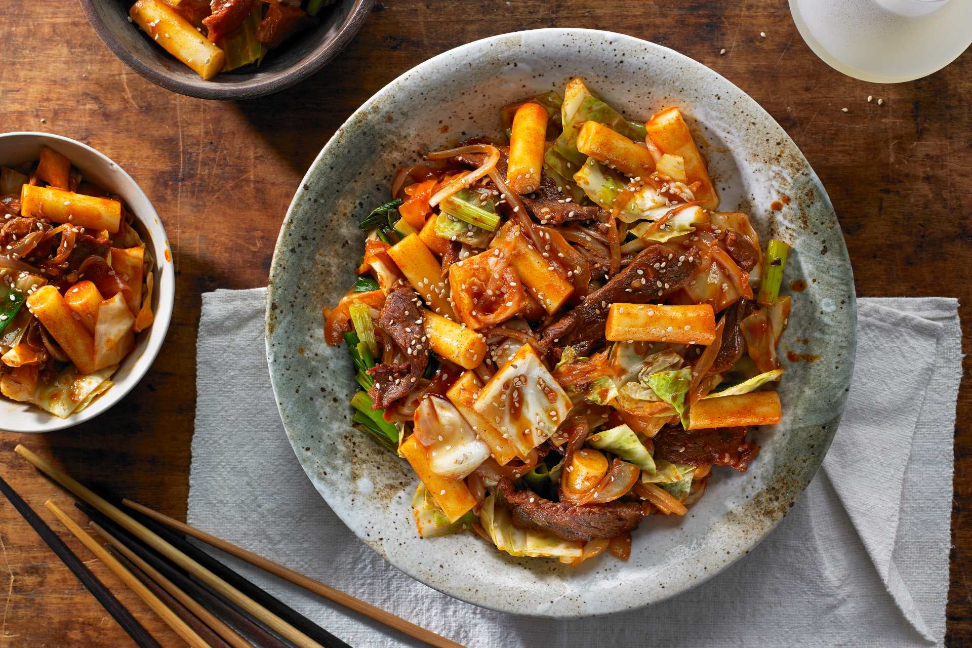 Tteokbokki is a delicious Korean street food made using soft, noodle-like rice cakes cooked in an umami-rich, usually spicy sauce, and served with various toppings, often including fish cakes, boiled eggs or scallions. It can be purchased from snack bars or street stalls, as well as being enjoyed at home.
