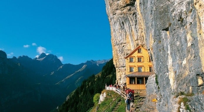 They say it's nice to work up an appetite before your dinner but would you be willing to hike three hours up a cliff to eat? That's how long it takes to reach the Äscher cliff restaurant in Switzerland, which sits around 5 km above sea level and is nestled in the side of a mountain in the Alpstein area.