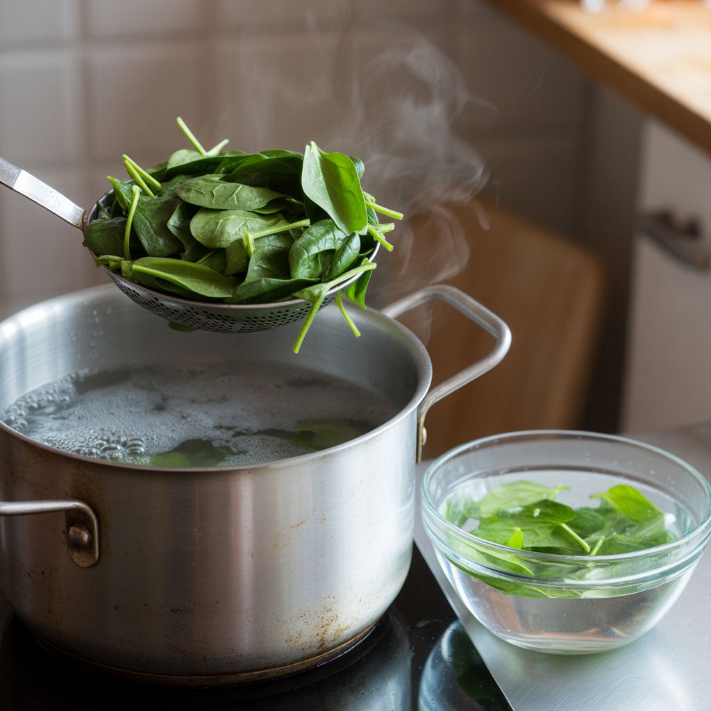 - Leafy greens (spinach, chard, kale): blanch in small batches, as they release a lot of water. Squeeze out excess moisture after cooling if you plan to sauté or bake them.