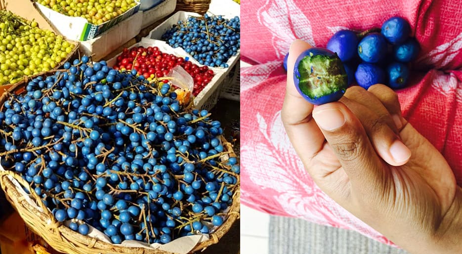 While the green variety of veralu looks just like the common green olive (Olea europaea), the blue olive is almost perfectly spherical in shape with a bright blue edible skin.
