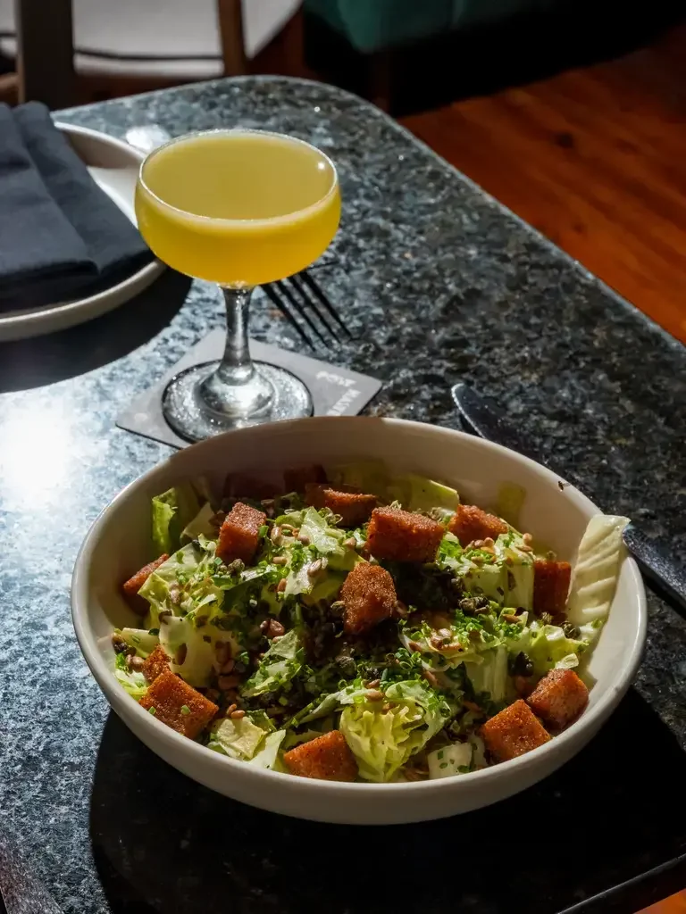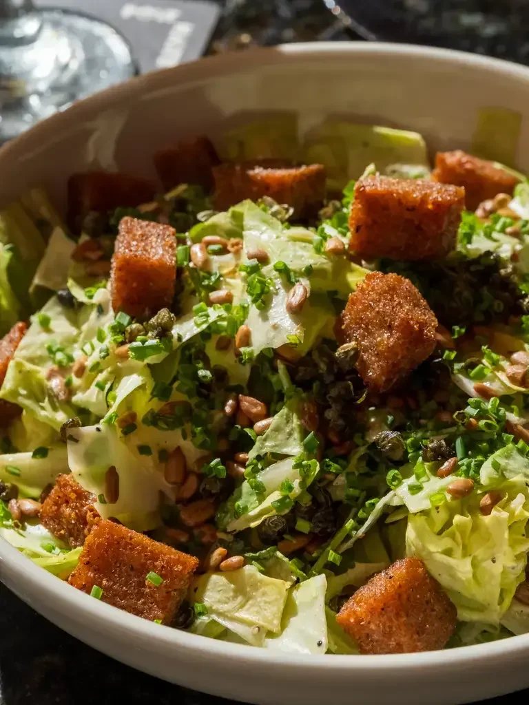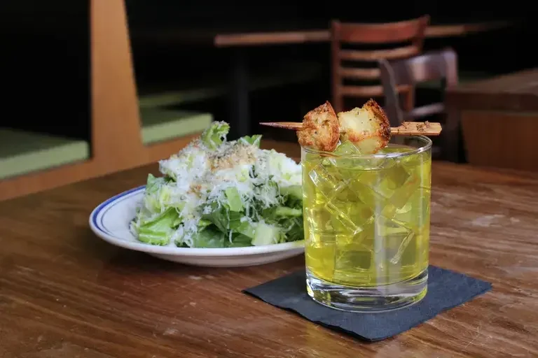 In 1924, the Caesar salad was born in Tijuana, a lightly funky marriage of romaine and croutons with a sauce of olive oil, eggs, Worcestershire, mustard, anchovies, garlic, black pepper, and Parmesan, concocted by Italian restaurateur Caesar Cardini. Over the past century, Caesar’s salad has been embraced by the most basic American restaurants, often made tableside with an air of throwback steakhouse charm, its dressing emulsified in front of witnesses—diners—watching the magic gel together. Drew Nieporent, whom I interviewed last month, describes the process as it should be performed by restaurant captains in his memoir: “Put an anchovy in a wooden bowl with a tiny bit of garlic and mash it around. Put the greens on top, add a little olive oil and lemon juice, plus a coddled egg. With two spoons, mix it all up, add the cheese and croutons, plus a touch of black pepper, and present it with a flourish.”