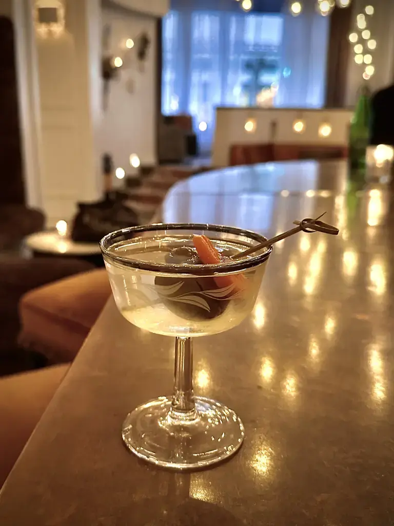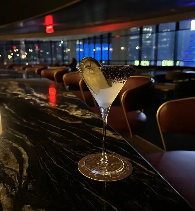 At The View, the rotating restaurant atop the Marriott Marquis in Times Square, a Katz’s martini is served in collaboration with the century-old Lower East Side deli. The cocktail features brisket-washed Bombay Sapphire, Noilly Prat Extra Dry, and Brennivín aquavit, served in a martini glass crusted with Katz’s pastrami spice blend and garnished with house-made pickles.