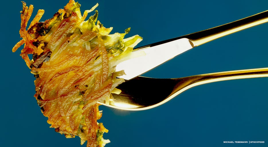 Even the name sounds cozy: Swiss Rösti. The classic comfort food from Switzerland is surprisingly easy to make, with some tricks along the way, and it turns potatoes into a main meal (which I’ve always really felt they should be—French fries with a side of burger, anyone?). The main meal, at least when the dish was first prepared, was breakfast. In the Swiss canton of Bern, farmers needing fuel for a long day’s work were plated up a mountain of grated, fried potatoes. The only crucial ingredients were potatoes and butter. Some folks par-boil the potatoes before grating them, others don’t (the Zurich version tends to be grated raw, with parboiling elsewhere). There appears to be no master recipe, and it is hard to pinpoint a single place or restaurant that serves the “ultimate” version—which is, itself, unusual, for what is considered a national dish. In this series, now several years on, we have looked at numerous dishes that are considered national or regional specialties, and have sought a best, or at least a quintessential, version of the recipe. This has often led back to a certain cook, kitchen, or at least a region. But Rösti (which is more properly pronounced, rer-shtee) is so simple, that few bother to write down a recipe for it. We’ve narrowed it down to the area around the Swiss capital, Bern. The only other certainty is that it postdates the discovery of America, because there were no potatoes in Europe prior to it. Otherwise, its history is anyone’s guess.