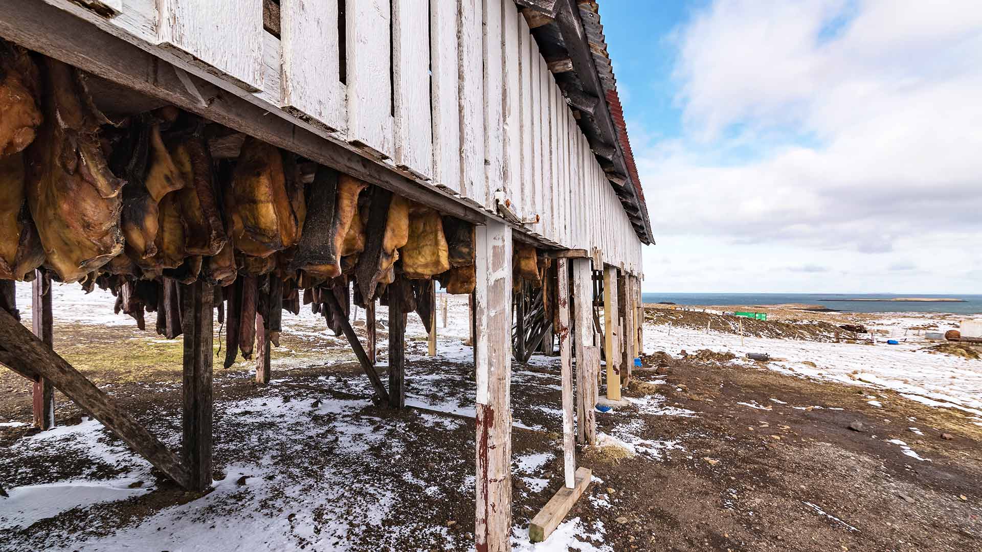 The history of Hákarl is somewhat nebulous, even though it is generally associated with the Viking age. Until then, sharks were contemplated as enemies, or, at the best, as a source of fat for using as a lubricant. Indeed, the meat of the Greenland shark is poisonous and can intoxicate whoever eats it for several days. This is because sharks have no kidneys and therefore expel urine from their entire body. In a few words, its flesh is full of it, with a concentration of urea and trimethylamine oxide that is certainly not very inviting.
