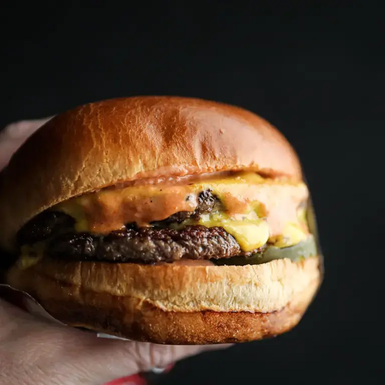 "I think a lot of people expected me to do a fancy, gourmet burger," said Duffy. "That's not exactly what I wanted to do." Instead, he's retained the fast-food style burger, complete with beef patties, American cheese, pickles, and a special sauce, sandwiched between a brioche-style bun in a number of combinations and additional toppings.