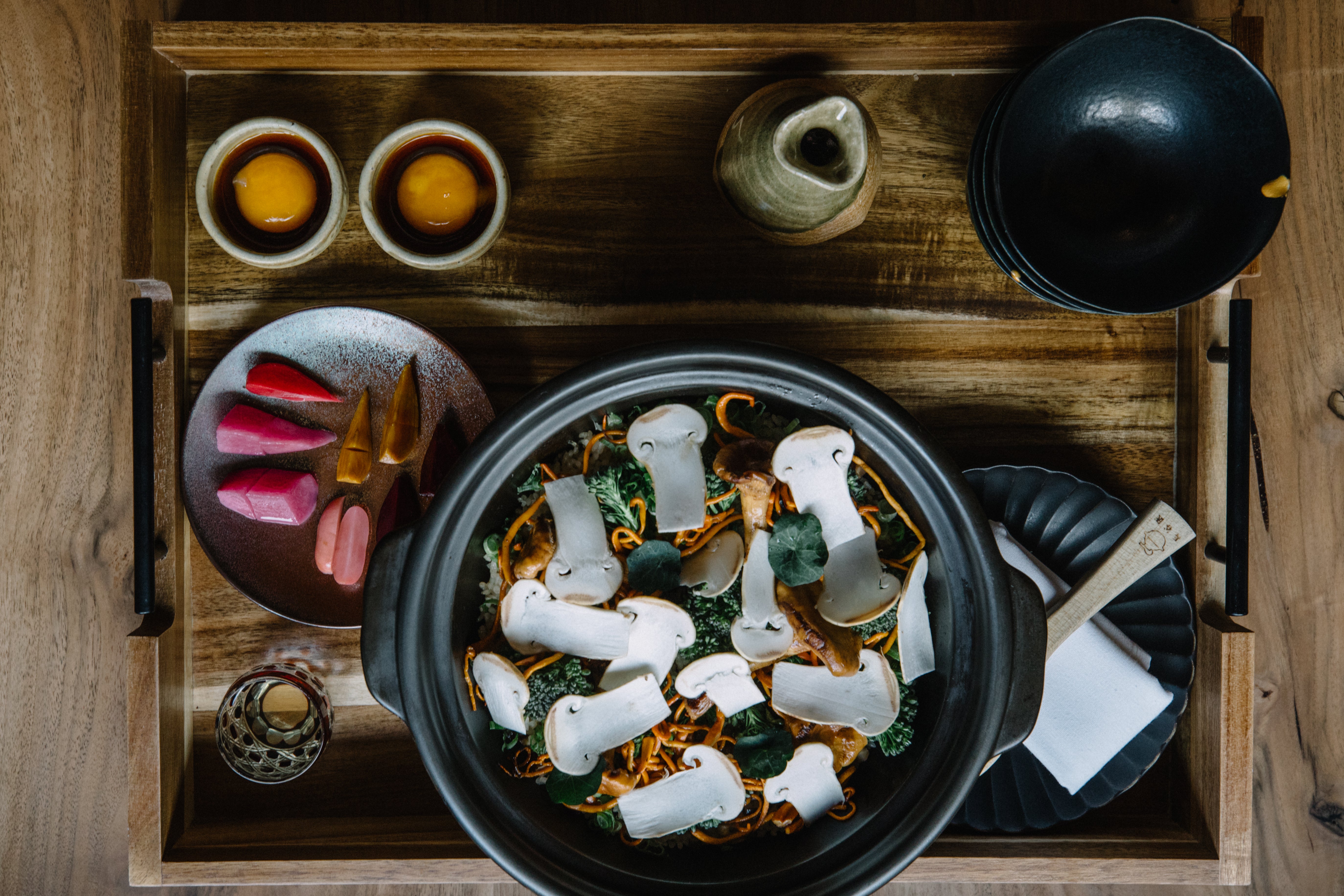 Nearly an hour from the Reno airport, past the winding mountain roads of the Humboldt–Toiyabe National Forest and along North Lake Boulevard, it’s easy to miss the small black building whose walls straddle the California–Nevada border. Windows down, you catch the wood smoke first. Inside, a wall of stacked logs frames an open kitchen where four heads of cauliflower hang above glowing embers, beneath racks of drying fish bones, daikon, and watermelon. At Smoke Door Tahoe Saryo, scraps become ingredients, and the fire is the throughline.