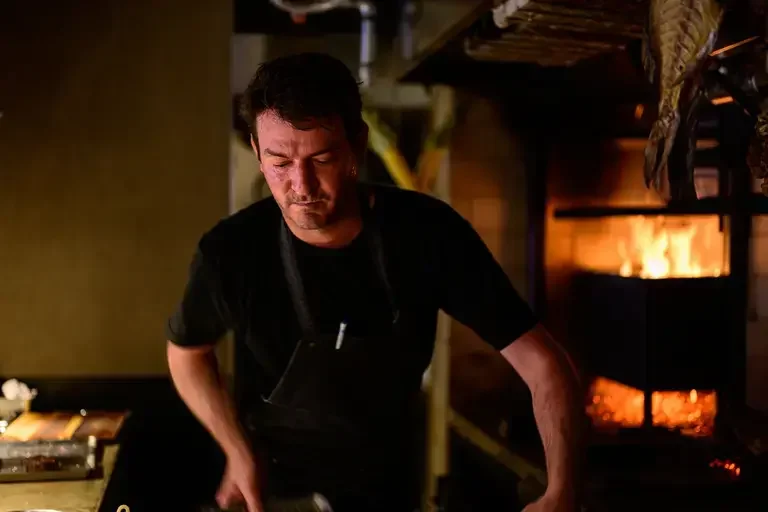 Wood-framed window banquettes set a warm tone, but the counter—front-row to the choreography—feels like the move for a restaurant with so many tricks up its sleeve. Those “tricks” are really a repertoire of nuanced ember-fire techniques that run from cocktails through dessert, led by Burges, a Saison alum who rose to prominence at Saison and Angler in Los Angeles. He now splits his time between Smoke Door’s Yokohama, Japan, location and Lake Tahoe.