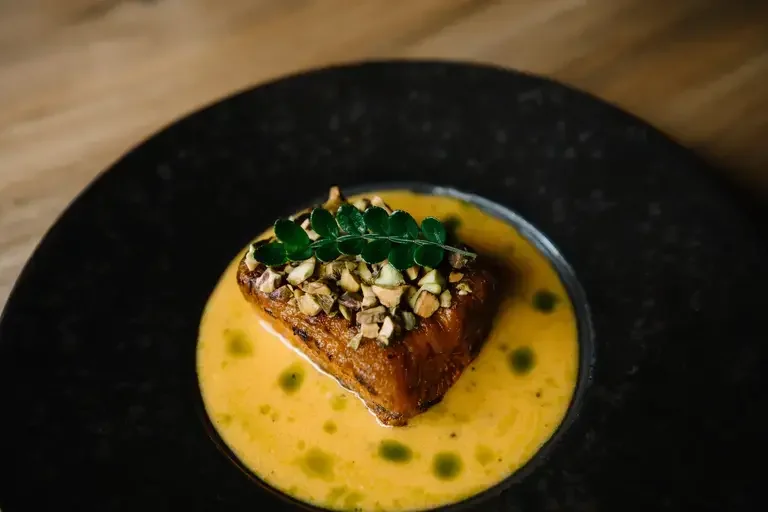 Amemiya is hands-on during service, carrying trays of amuse-bouches: cold-smoked avocado toast half-soaked in brown butter and tamari; microgreens and dried wakame crisps; and glistening spheres of smoky tomato concassé stuffed with barbecued tomatoes in tomato water and miso. Each bite lands like a small reveal, and it’s only the beginning.