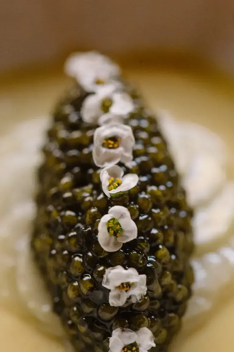 Chef Tyler Burges explains that the now-fragrant heads—listed as “sky-grilled cauliflower”—are flash-fried, then suspended over smoke for three days and regularly spritzed with ember oil, yielding a crackly exterior and a tender, juicy core. In service, the vegetable appears on the ten-course tasting menu, brushed with brown butter and white tamari and finished with fried shallots.