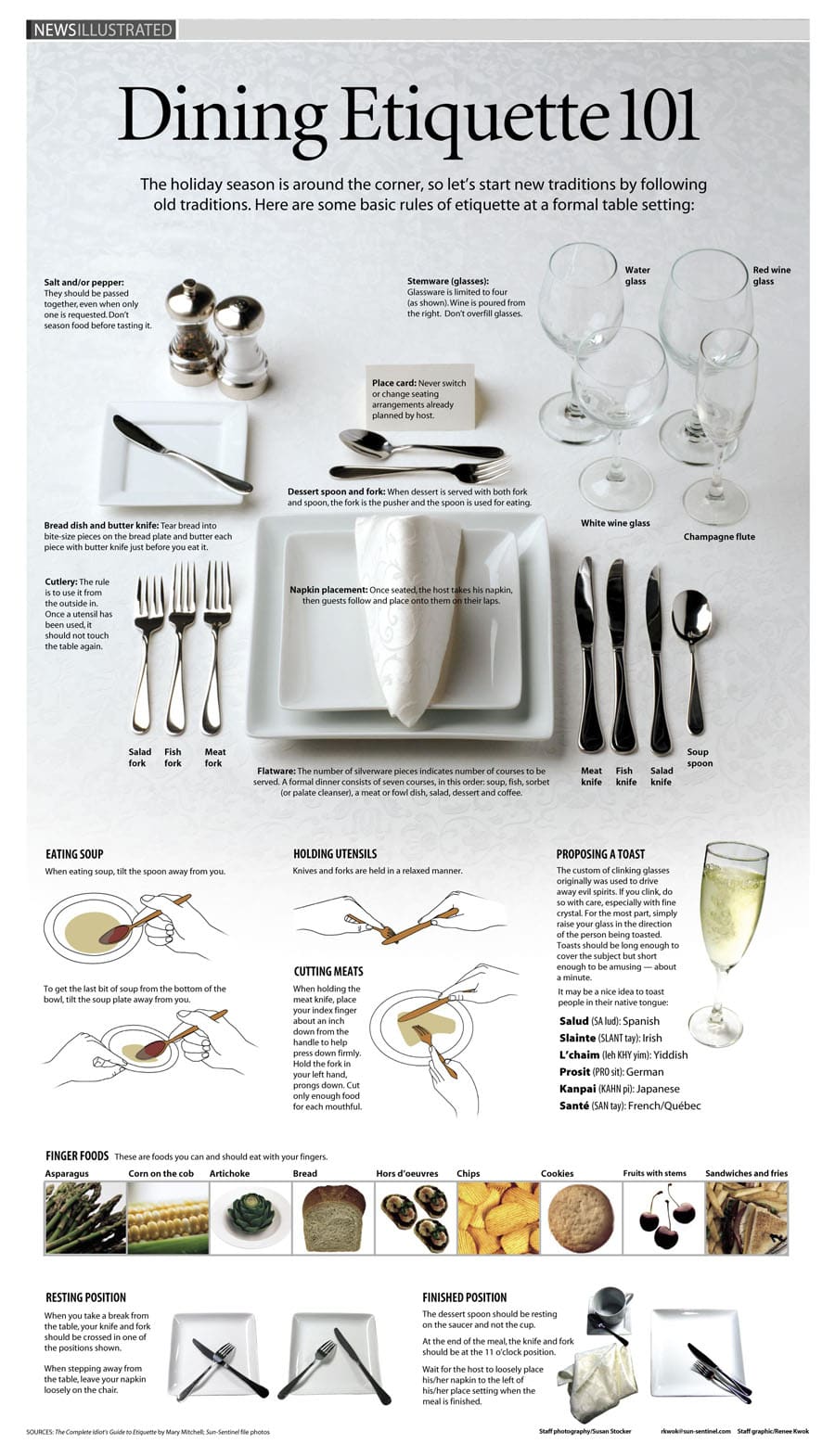 The graphic also holds etiquette tips on how to eat soup, how to hold the utensils correctly and how to propose a toast at the dining table correctly. Delve into the graphic for more specifics on how to avoid faux pas in fine-dining settings. And to up your etiquette even more, watch this simple video guide on how to eat soup.