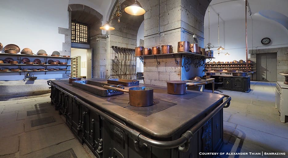 The site has held fortresses since the 9th century era of Muslim rule, but today’s enormous white palace was built between 1738 and 1755. Down stone stairways sit the vast kitchens, notably cooler than upstairs. The kitchens originally came under the ‘oficios de boca’ and included a bakehouse, cellar, fruitery, confectionery, pastry, saucery, potagerie for vegetables and guardamangier. There were then three distinct kitchens for the household, ladies and the King (or Queen) themselves.