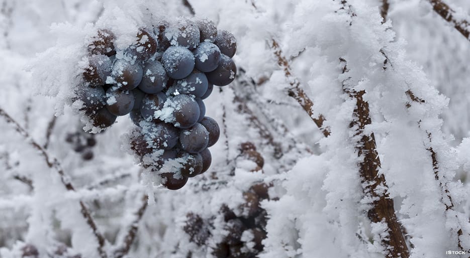 Ice wine just might be the craziest wine out there. The more I think about it, the crazier it sounds. Imagine a vineyard where the grapes are left to dangle on the vine, exposed to the outdoor elements until Frosty the Snowman himself comes and picks the frozen bunches. He then goes and puts the frozen grapes in a press and squeezes them in such a way that only the deliciously sweet and concentrated juice comes out. Afterwards, everybody in the winery joins hands and sing “let it snow, let it snooow…” I might be exaggerating a bit to make a point but trust me, making ice wine is no easy task.