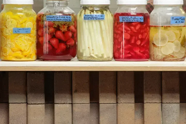 Whether it’s cabbage, cucumbers, carrots, or radishes, he recommends starting with seasonal fruits or vegetables that have a firm texture and good crunch. These hold up well during fermentation and yield a satisfying bite.