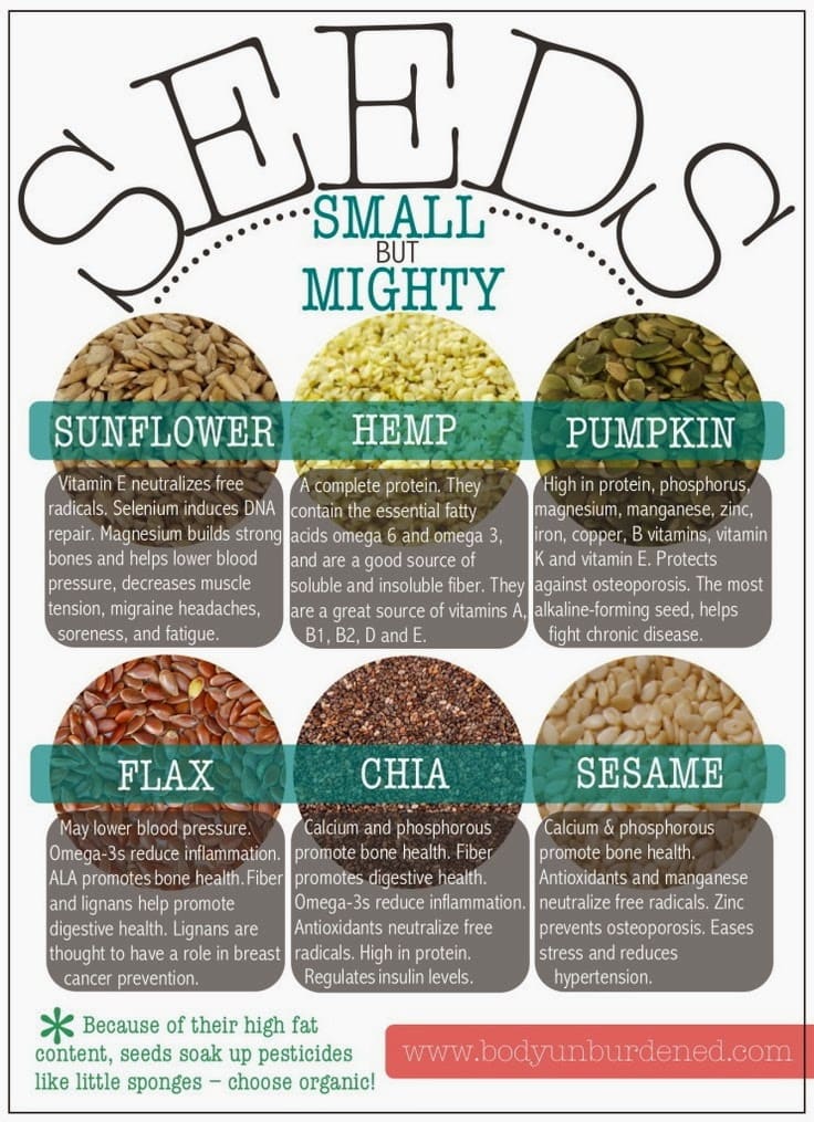 This visual guide from Body Unburduned focuses on six seeds proven to be chock-full of nutrients that do a body good: chia, hemp, sunflower, pumpkin, flax and sesame.