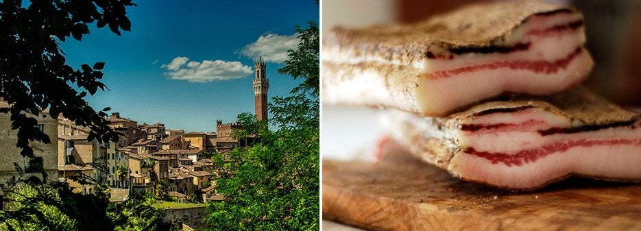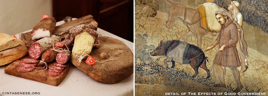 The Cinta Senese is the forerunner of all Tuscan pig breeds. It was even raised by the Etruscans and followed the Romans in their migrations. It came to the aid of peasants in the Middle Ages during periods of pestilence and famine. Its ancient origins are evidenced in a well-known painting of 1340 by Ambrogio Lorenzetti, “The Effects of Good Government” portraying a small pig standing next to a peasant.