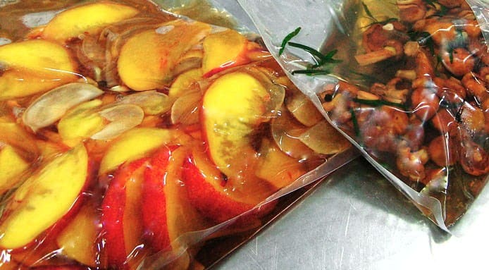 A way around this when using a smaller sealer is to at least partially freeze any liquids in the bag before sealing. But you can’t make Champagne-infused strawberries, or hot-infuse these tarragon chanterelles or brandied peaches properly.