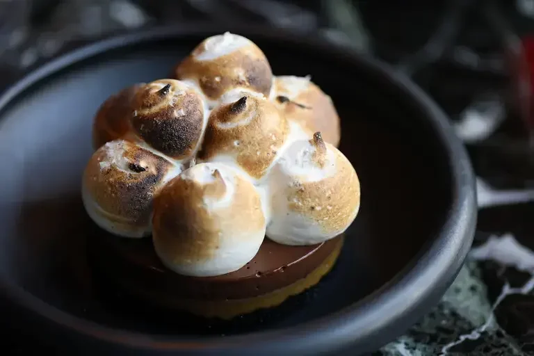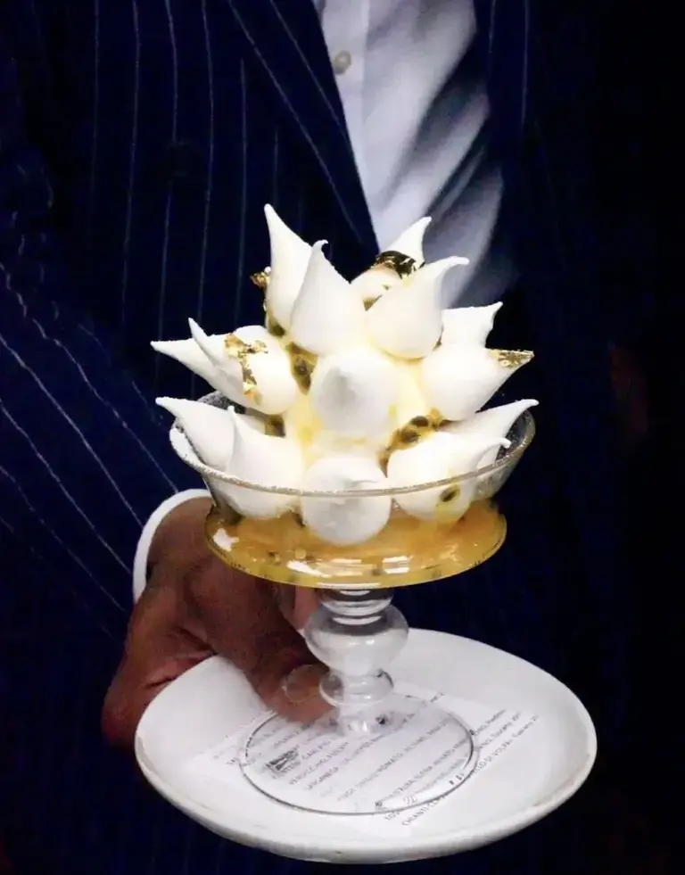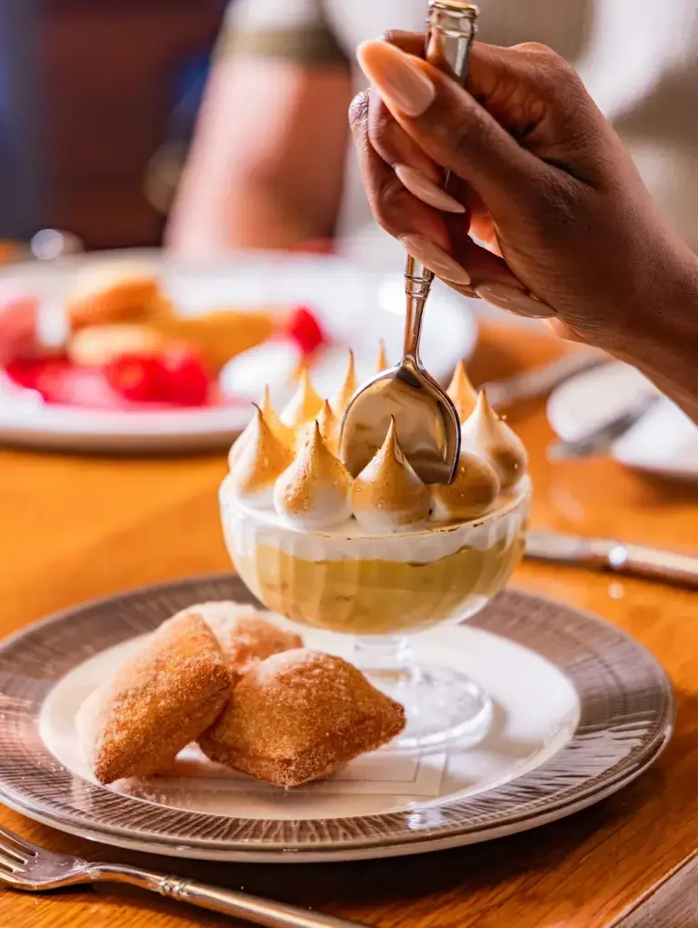 Meanwhile, pavlovas are popping. Pastry chef Sarah Osborn at Sado in St. Louis constructs one cradling coconut and charred lemon crémeux with coffee granita; New York City’s Quality Meats pastry chef Lucy Blanche riffs on an orange creamsicle with vanilla mascarpone mousse, citrus curd, and orange segments; and pastry chef Rachel Sherriffe at Marcus DC in Washington, D.C., offers one brimming with olive oil pastry cream, pickled Asian pears, citrus jam, and pomegranate Aperol jus.