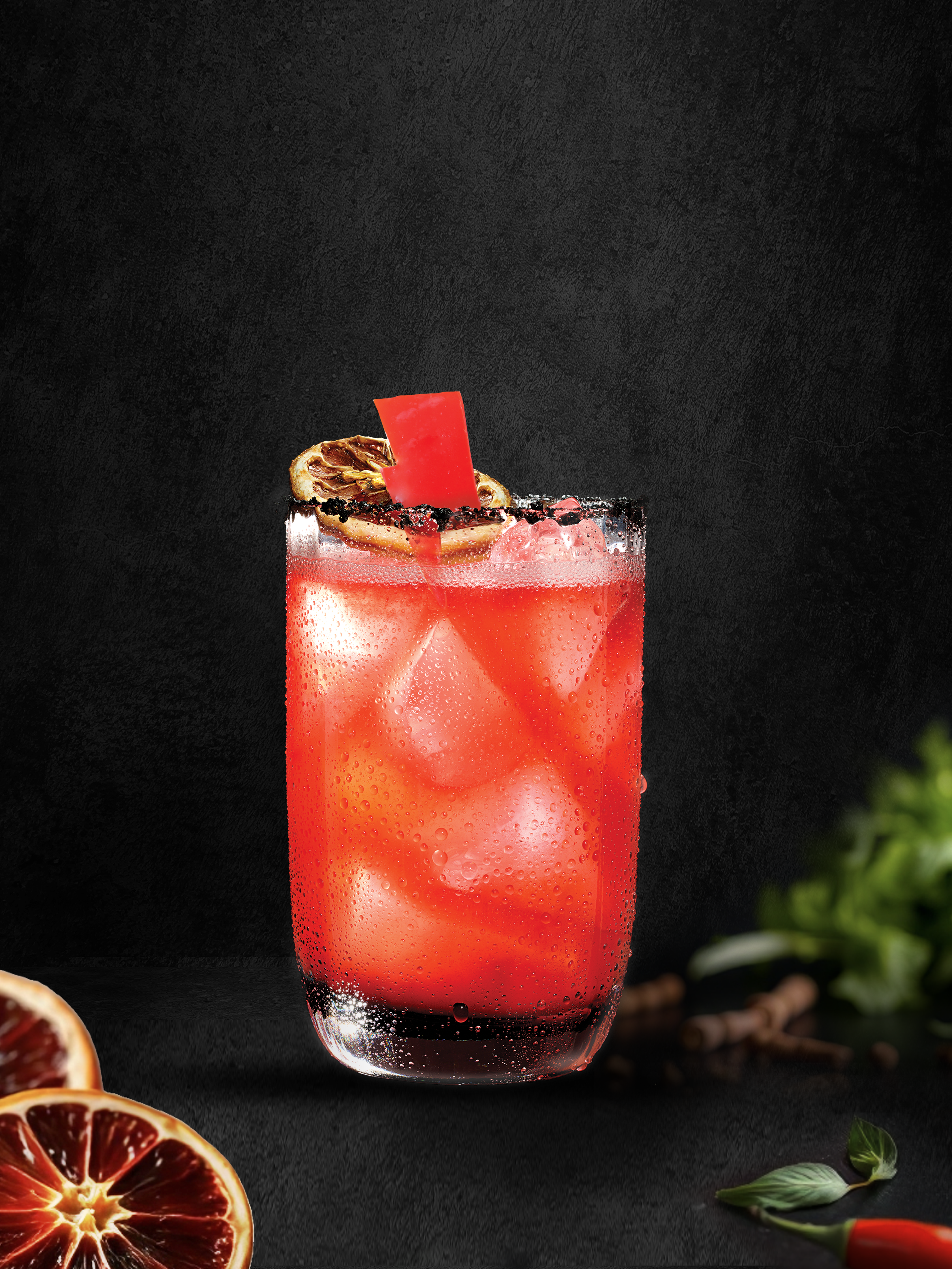 A fiery yet refreshing cocktail that blends Marcado 28 Blanco tequila with blood orange, lime, cilantro, and chili heat, balanced by agave for a drink that’s equal parts bold and bright.