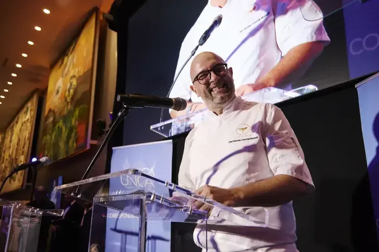 This approach defines Massari's philosophy as he prepared to cook for approximately 350 diplomats, dignitaries, and global leaders at the United Nations Correspondents Association dinner, a historic gala inside the UN’s Delegates Lounge and Flag Hall. Selected for this honor, the Bologna-born chef saw the massive event exactly as he sees service at his well-regarded 18-seat Upper West Side restaurant: an opportunity to use food as a universal language that transcends politics, borders, and conflict.