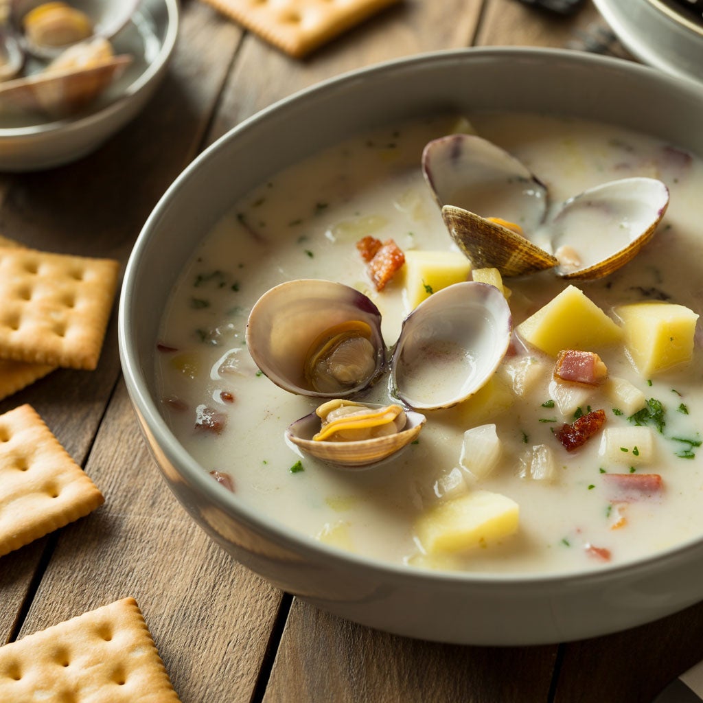 New England clam chowder developed first, emerging from the fishing communities of Massachusetts and Maine, where clams were abundant, and dairy was readily available. Early recipes from the 1700s describe simple preparations of clams, pork, onions, and ship's biscuits or crackers, with cream or milk appearing in later versions as the dish evolved.