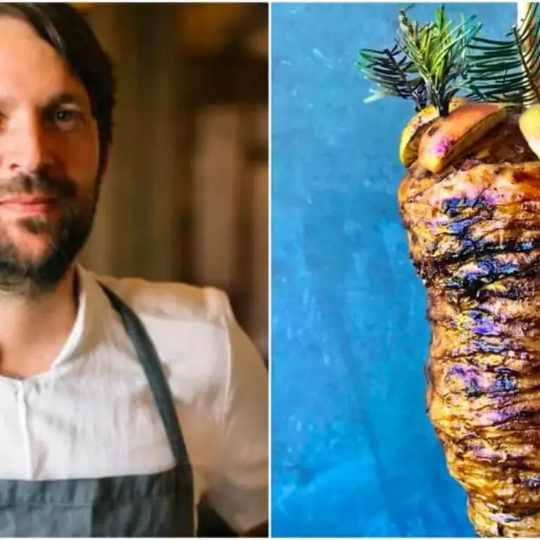 In the same way the Noma shawarma features thin slices of celeriac covered in various purees made from more celeriac, truffle and umami-packed fungi. The shawarma tower is then cooked on a bbq, with apples spiked at the top so that the juice runs down onto the 'meat.'