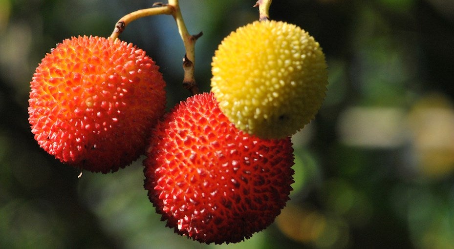Although the strawberry tree is commonly used for ornamental reasons, the red berry fruit yielded by these evergreens is edible and remarkably similar to large cherries, except for the rough textured exterior skin. Once opened, the skin reveals a soft and grainy intense yellow pulp with a refreshing flavour, both sweet and sour.