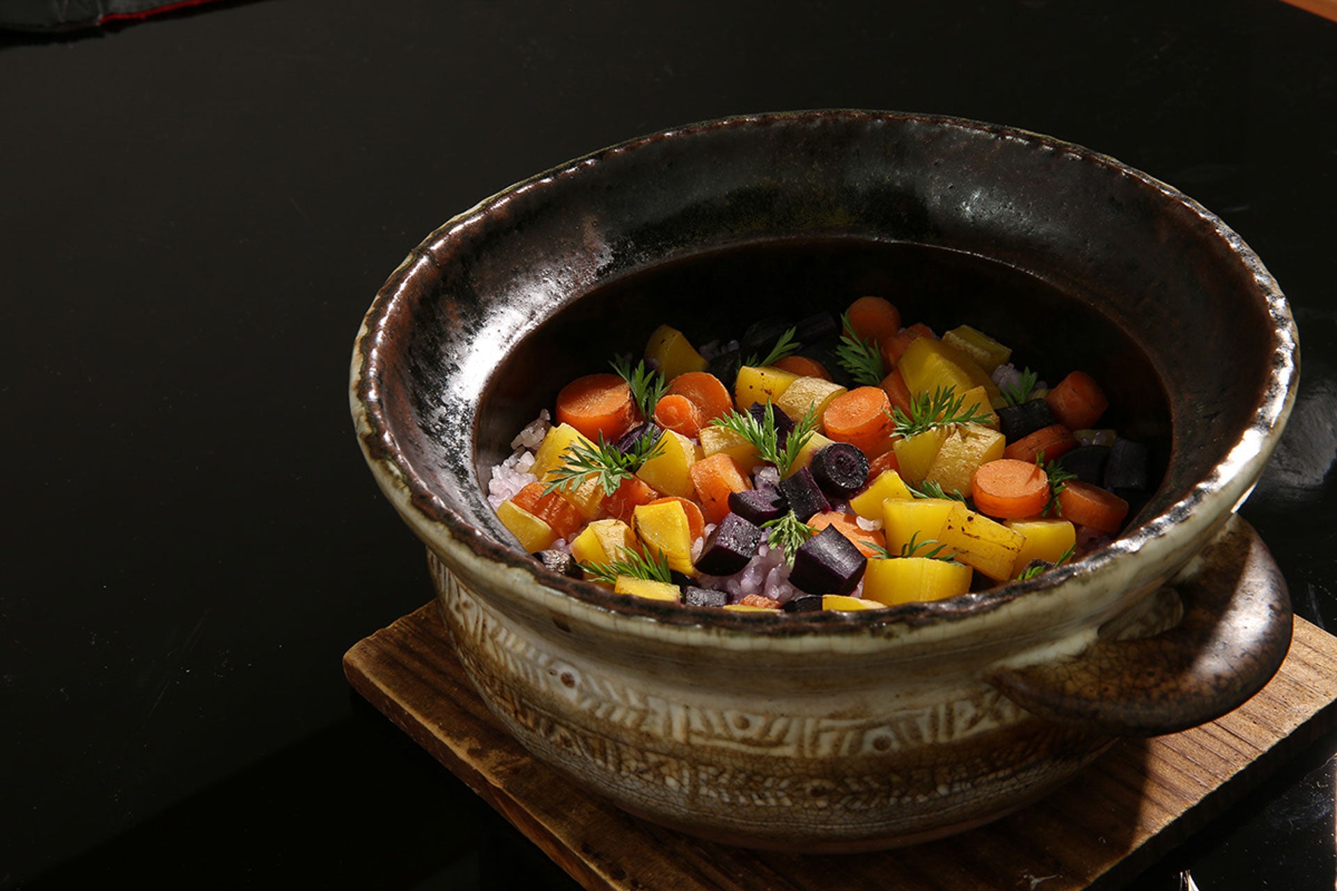 The ‘Dentucky’ Fried Chicken is another menu stalwart. Fried chicken wings in a crispy batter with steamed mochi rice and other seasonal ingredients are served in a customised takeout box with the chef's smiling face in print.