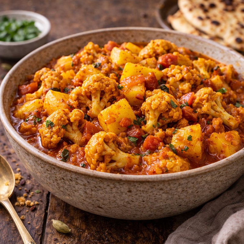 Aloo gobi can be served either as a tasty side dish or as the main part of the meal, accompanied by classic Indian sides such as naan bread or steamed rice. A sprinkling of fresh cilantro brings both a bright color and fresh aroma to the dish before serving.