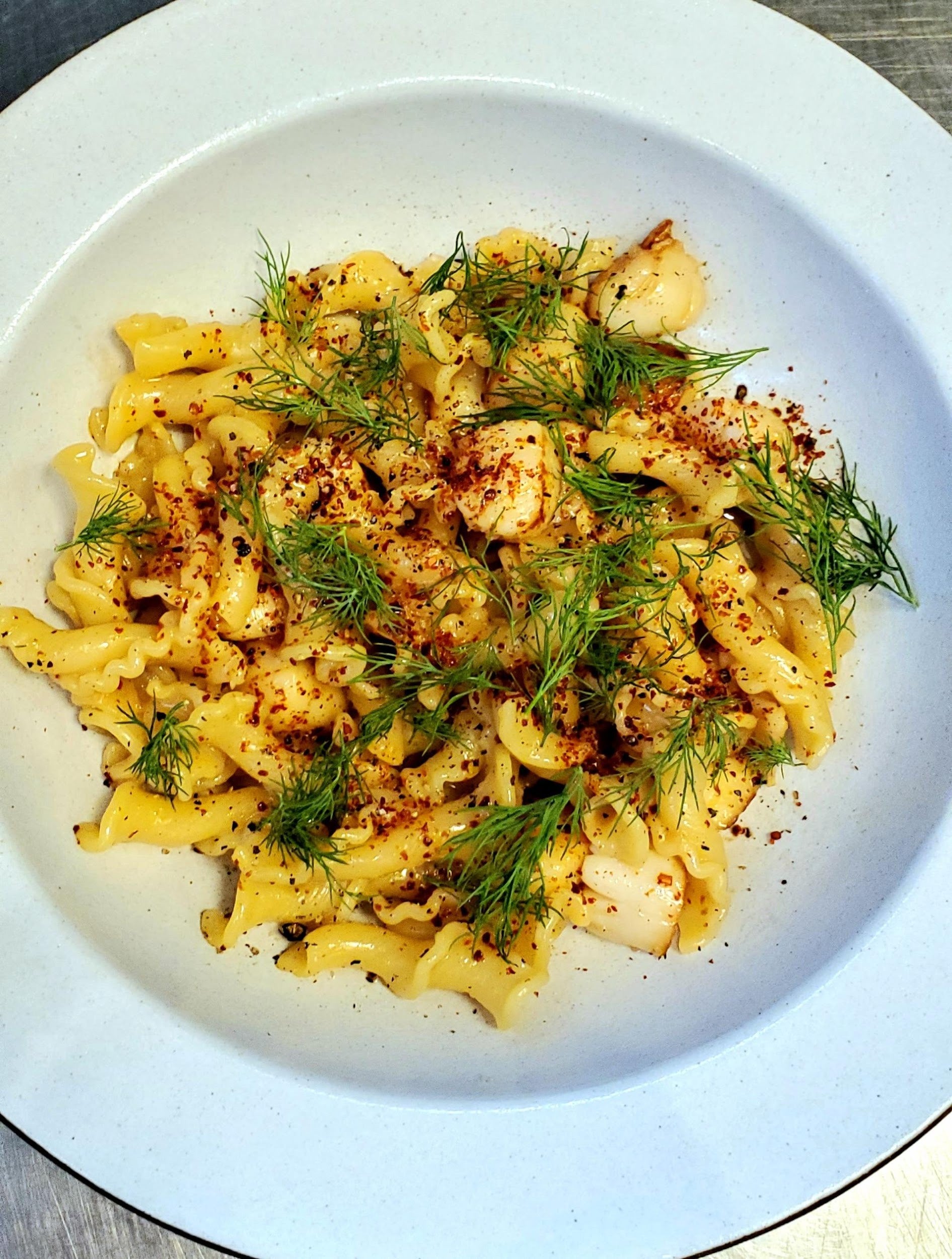 A refined yet comforting pasta from Jean-Georges Vongerichten featuring sweet bay scallops, a garlicky butter emulsion, and a bright finish of white wine, chili, and fresh dill.