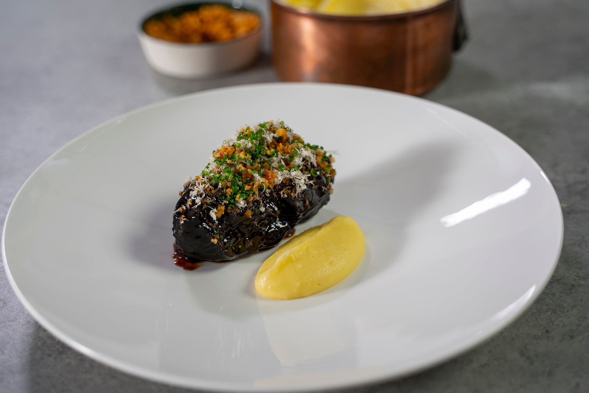 Finish the glazed cheeks by adding Maldon salt, crispy onion, chives and grated horseradish.