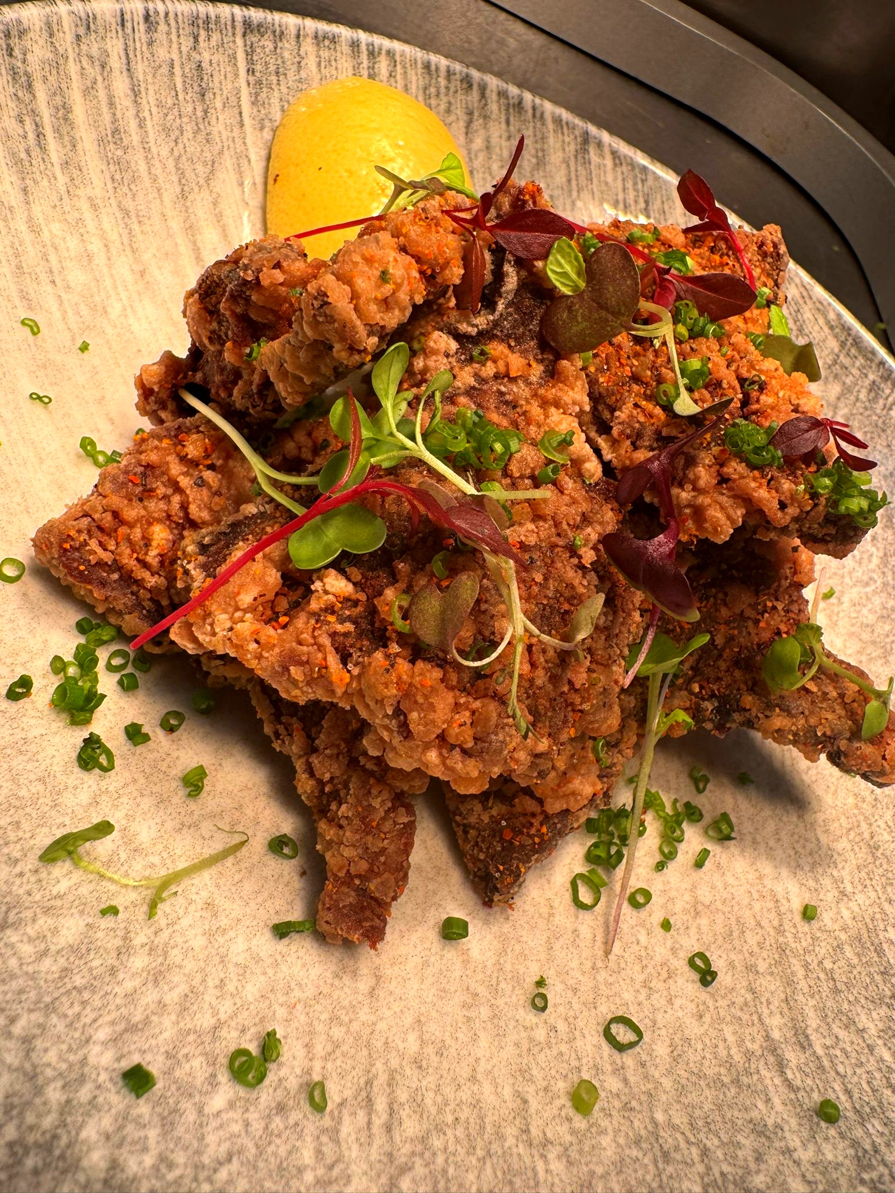From Ogawa’s theatrical tuna cutting events in Philadelphia, chef Carlos Wills transforms the tuna’s bloodline (chiai) into a crispy, deeply savory karaage. Marinated in soy, garlic, and ginger, dredged in potato starch, and fried to golden perfection, this dish elevates an often-overlooked cut into a showstopping bite. Served hot with togarashi, fresh herbs, and lemon, it’s a vibrant combination of texture, spice, and brightness.