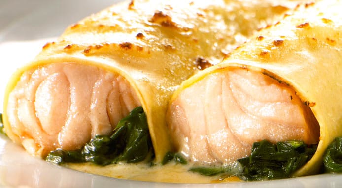 Salmon fillet and fresh spinach wrapped in lasagna sheets: an easy cannelloni recipe from Italy, for a delicate seafood pasta dish perfect for all seasons!