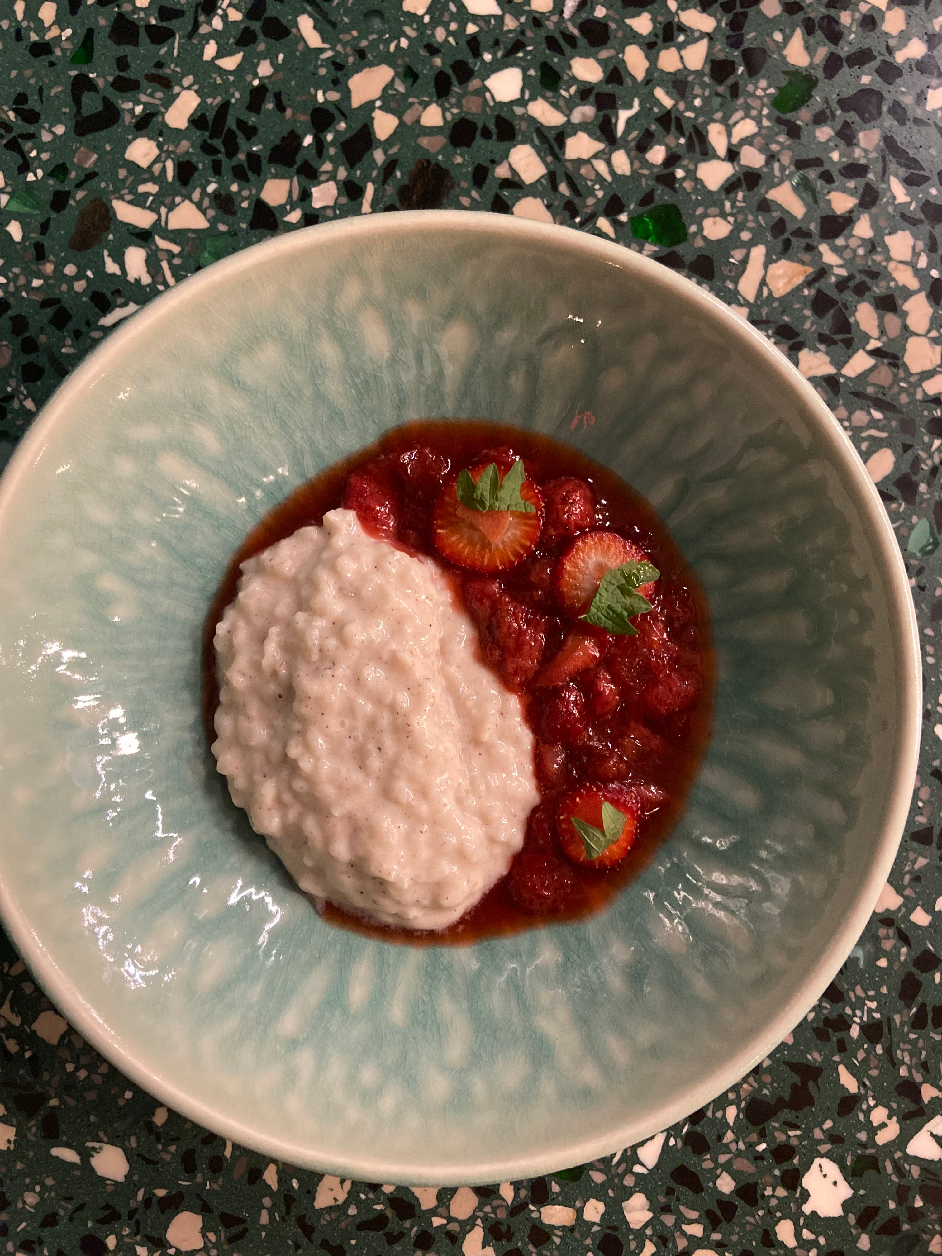 Over the years, I’ve worked on my rice pudding recipe. I like using great rice like Carolina Gold from Anson Mills. I cook it with coconut and almond milk because so many diners are looking for dairy-free options, and also because it just eats lighter. The strawberry jam screams summer, and it’s also a way to use up fruit that is bruised or even a little underripe.