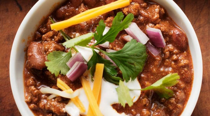 Discover this Mexican chili recipe with cheese, cilantro, onions and sour cream. Read all the ingredients and a step-by-step directions!