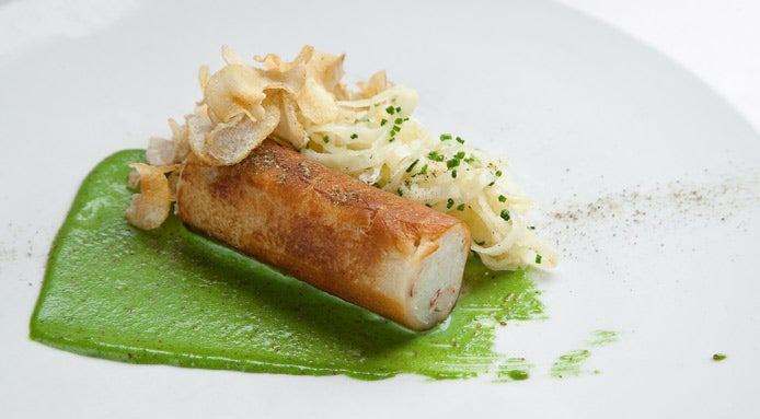 Place the crab roll on the celery mayonnaise and surround with a pile of celery noodles and a pile of chips.
