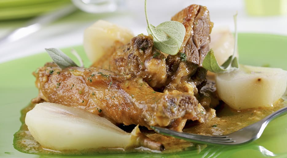 Add the meat juices to the sauce along with the sage, season to taste and serve with the drained pears and the duck.