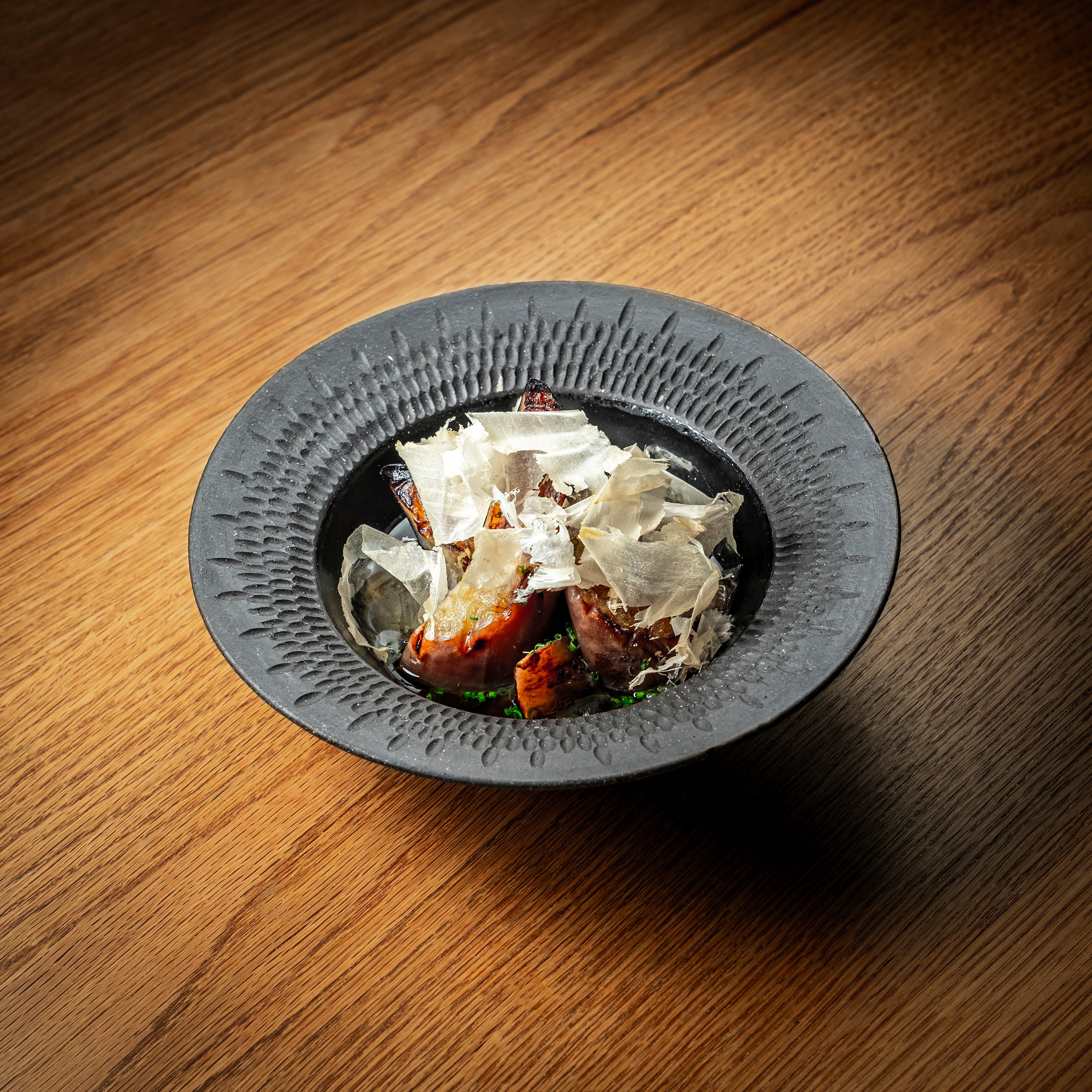 - Place the grilled eggplant in a bowl, pour the hot marinade over it, and garnish with chopped chives and shaved katsuobushi.