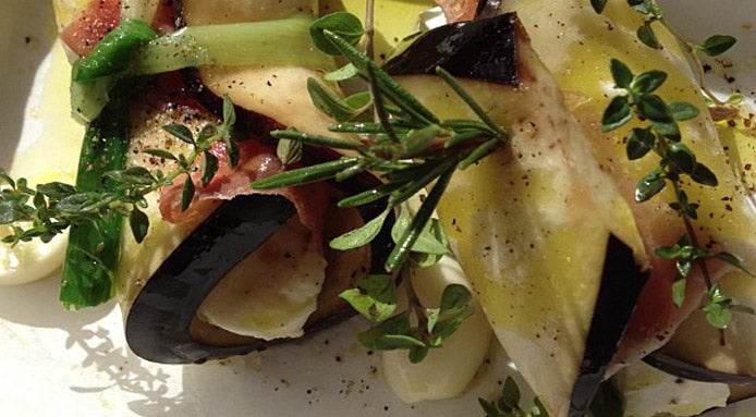 - Remove the eggplant from the oven. Lower the oven temperature to 350°F. On each eggplant piece, place a slice of prosciutto and a slice of mozzarella. Roll the pieces from the small end forward, and secure the neat little bundle with a toothpick or by tying a chive around it.