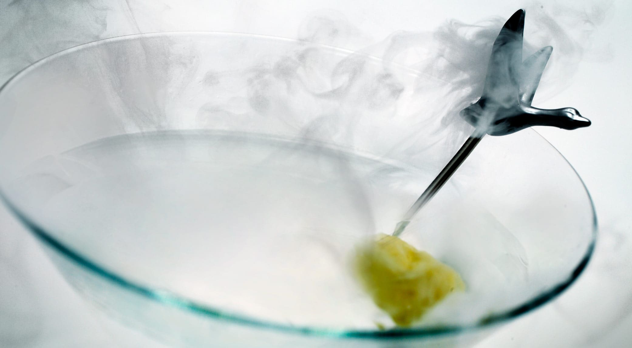 Garnish with a spherified olive, pour liquid nitrogen over the top to create a deep freeze effect.