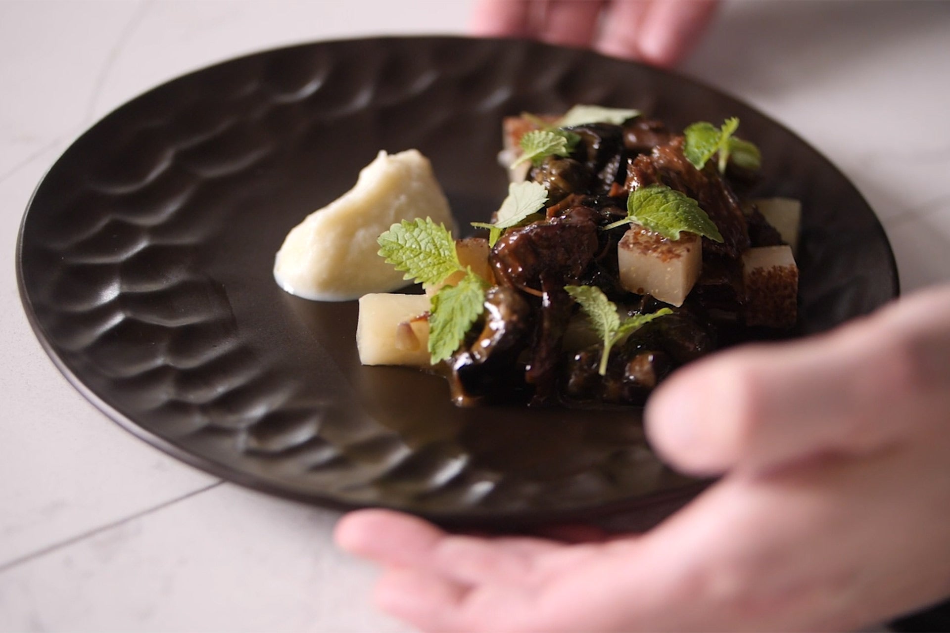 Place the beef cheek back in the Dutch oven and cover with beef stock. Cook in a 350°F oven for 3 hours. Let it cool down in the liquid. Strain the braising liquid and break down the cheek to chunks. Reduce the liquid in a pot with the cheeks. Set it aside.