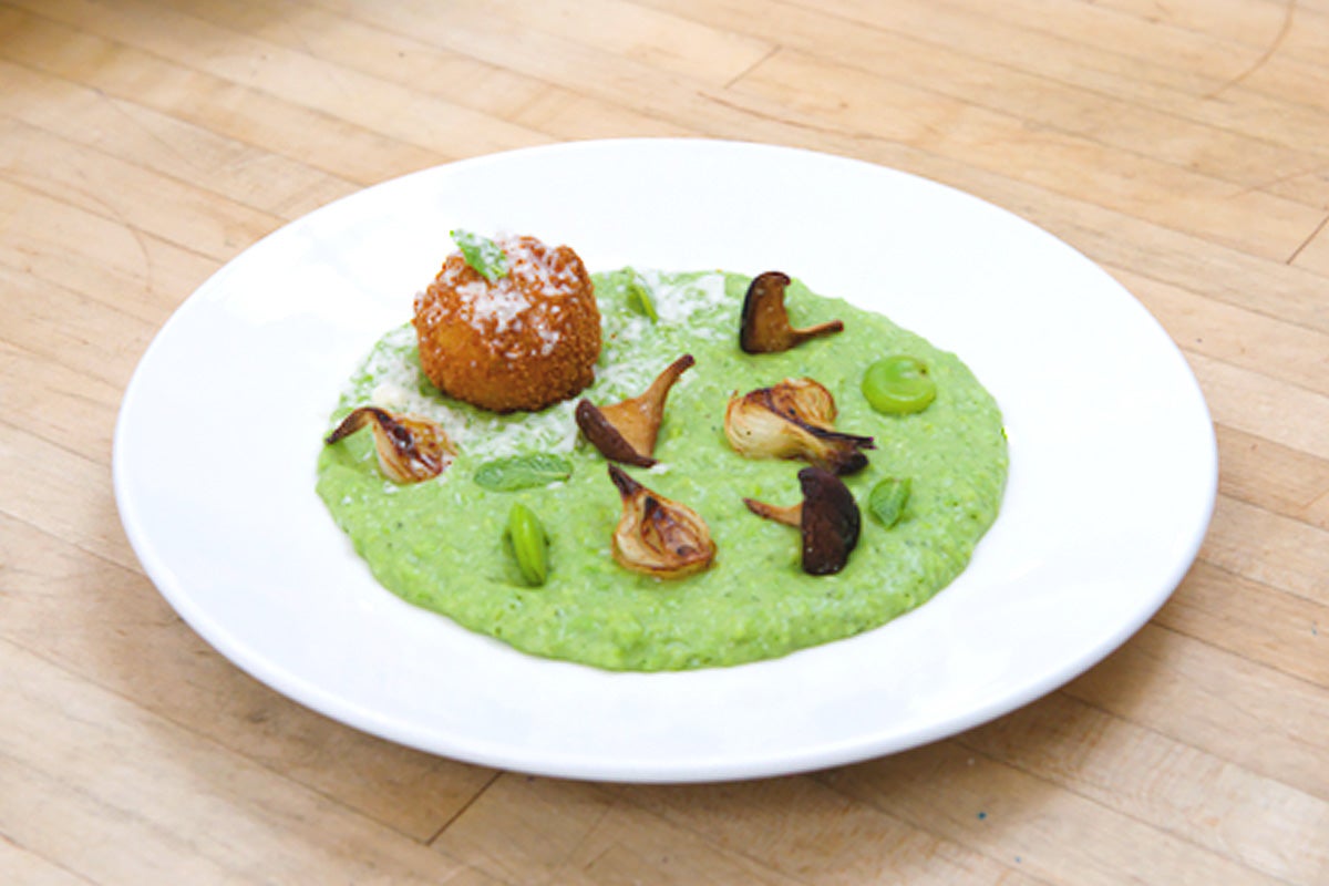 Arborio rice: 240 g, cooked in 500 ml of stock made with fava bean leaves & pods