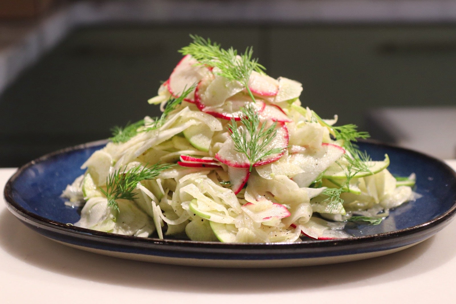 A crisp fennel, apple, and radish salad that brings fresh contrast to richer Hanukkah dishes, adding brightness, crunch, and a clean finish to the table.