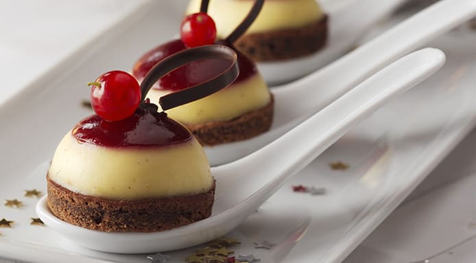 Cotillons are a French dessert speciality with a sponge cake base, jelly and vanilla custard, to serve on spoons. Follow the recipe, try to prepare it!