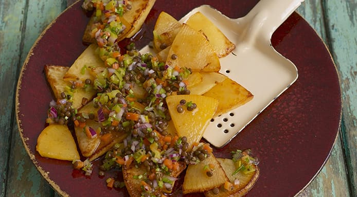 An easy and tasty fried swede recipe served with lentil vinaigrette: it's simple to prepare but delicious, try this recipe at home!