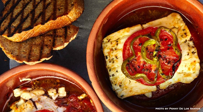 One or two slices of good tomato, a lavish slice of feta cheese and pieces of bell and hot pepper are doused with olive oil, generously sprinkled with oregano, and grilled in a very hot oven.