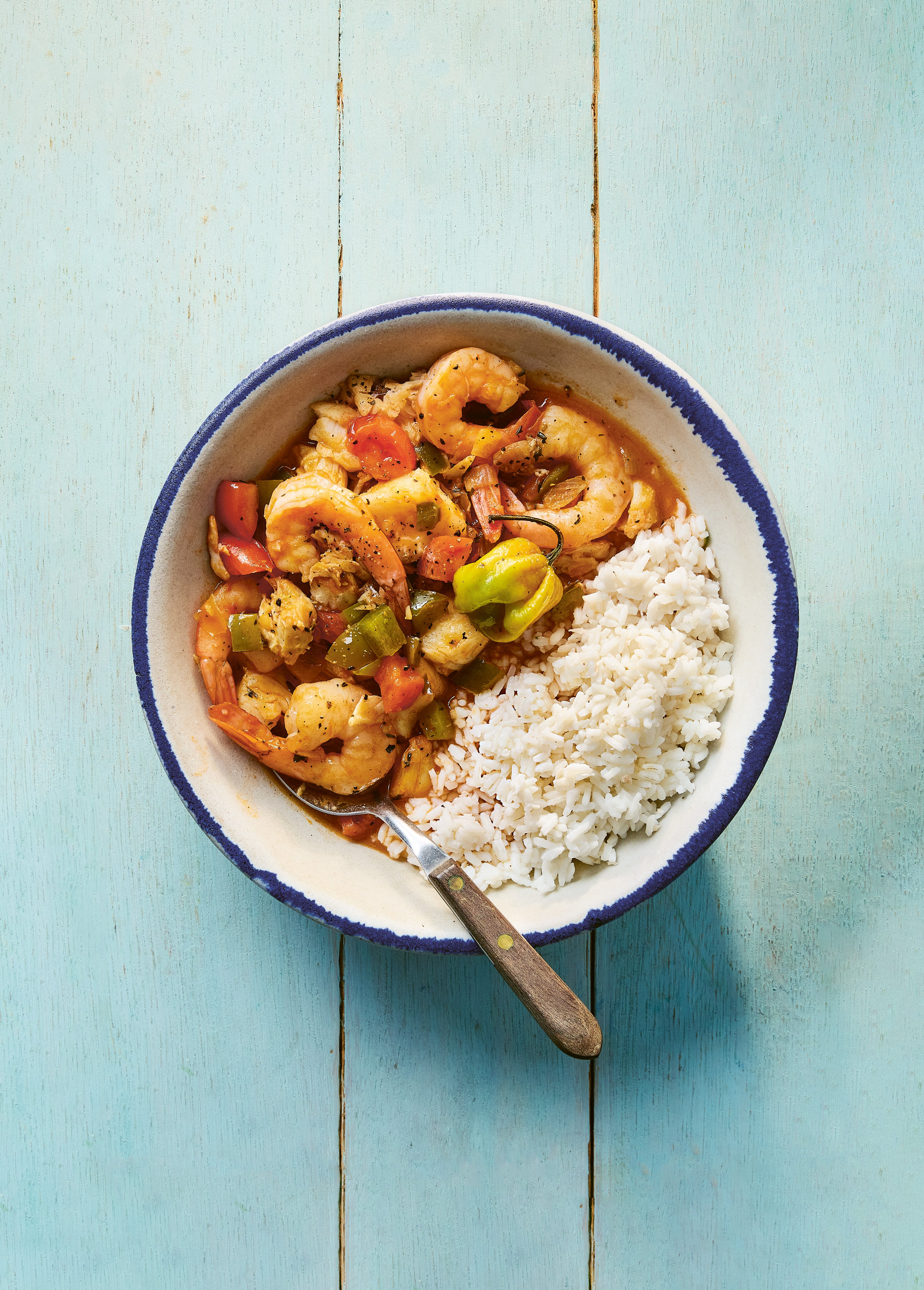 - Stir in the tomatoes, then add the shrimp (prawns), fish, crab meat, Scotch bonnet pepper, bay leaf, and ¾ cup water. Season with salt and pepper to taste.