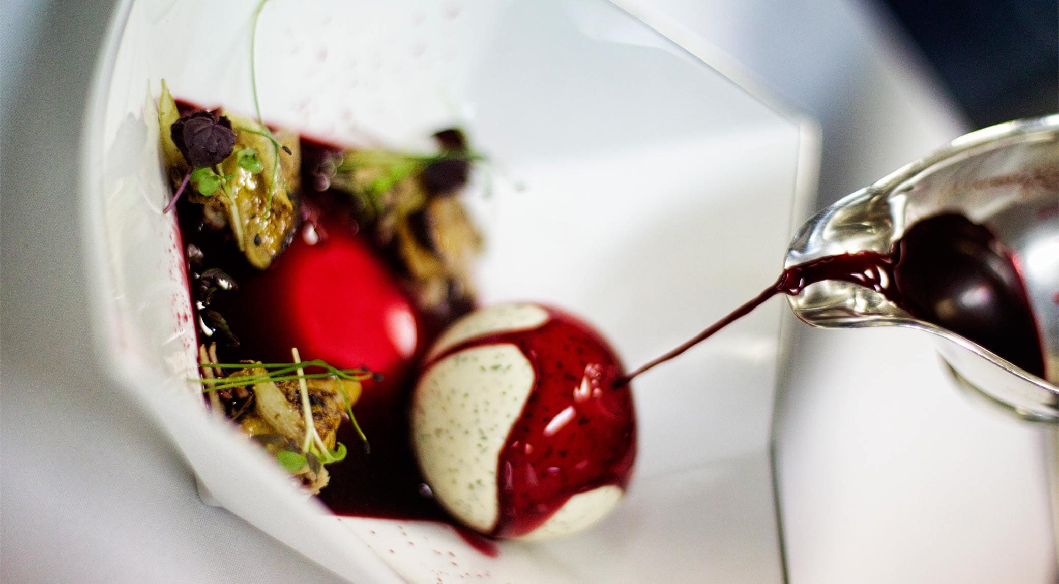 Dissolve Borscht PJ in the celery broth, strain it and pour it on the sphere when hot.